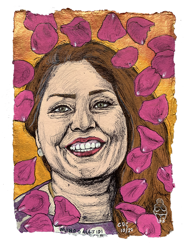 The women I have drawn who have been murdered are surrounded by falling rose petals (and I have by no means drawn all of them; there are too many). In many cultures, roses are a traditional symbol of spiritual light and renewal, and of the fragrance of heaven, as roses tell us there is heaven on earth. Roses are an especially potent symbol in the venerable and profoundly poetic Persian civilization and culture. Each woman’s rose petals are a different color, in honor of her individuality. The backgrounds are iridescent, shining colors, meant to refer to icons. Their sanctity is not in how they conformed to rules meant to deny the variety of pleasures the world gifts to us and we gift to ourselves and beloved others, but rather, how they confirmed their unique identities in life, growing like plants in the sunlight and showing such different faces and features to the world. I hope that the families and friends of the women I have drawn might recognize a spark of the person they love, even if the likeness may be imperfect.